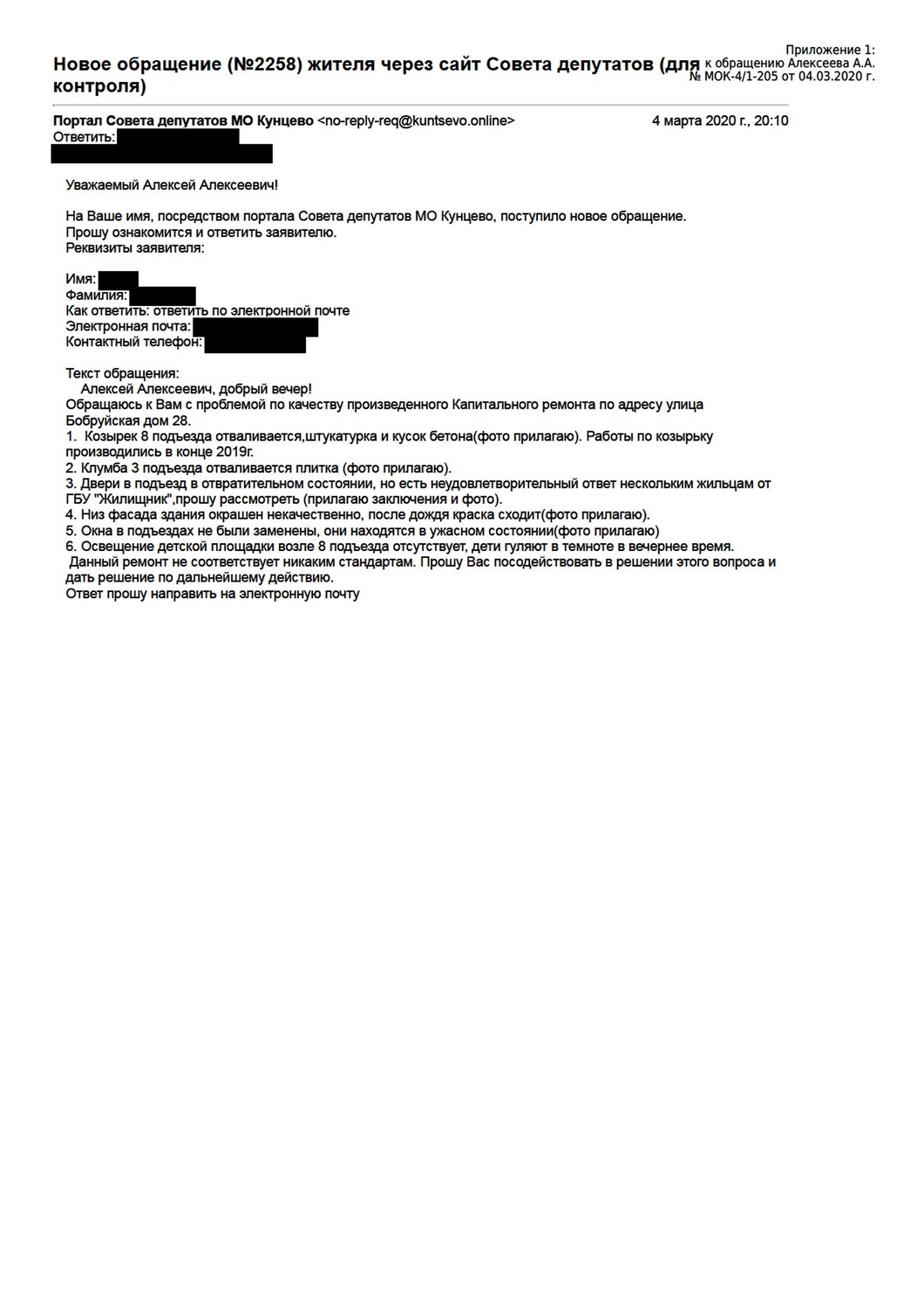| О результатах комиссии по капремонту на Бобруйской, д. 28 (продолжение) О результатах комиссии по капремонту на Бобруйской, д. 28 (начало) О фальсификации акта комиссии Бобруйская, 28 Направил обращение о качестве проведения капитального ремонта в 28 доме по ул. Бобруйская. Все развалилось. Портал народных депутатов Кунцево |