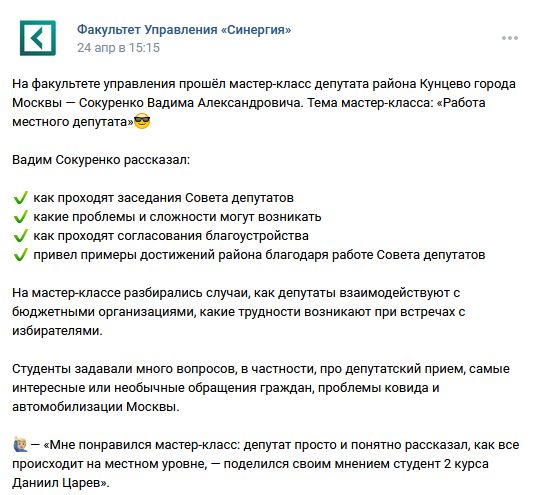 Вадим Сокуренко: Мастер-класс: «Работа местного депутата» на Факультете Управления «Синергия»