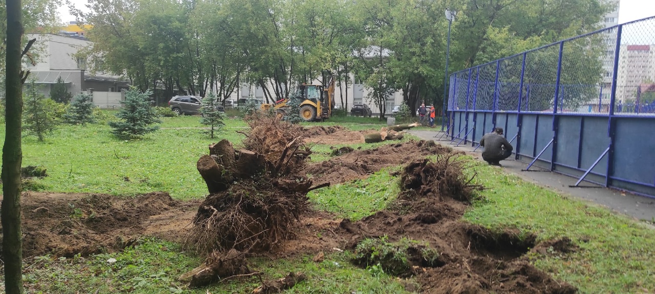 На спортивной площадке у Василия Ботылева, 14 вырубают деревья. Документов на вырубку опять нет, порубочных билетов нет, для чего вырубают - не понятно.