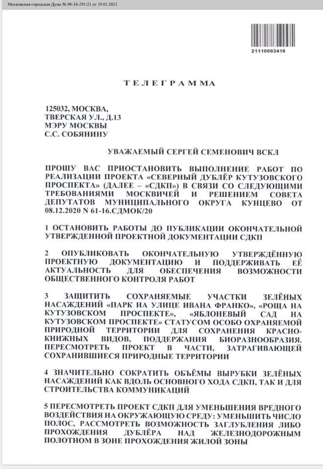 Муниципальные депутаты разных районов Москвы опубликовали открытое письмо на имя мэра Сергея Собянина. В нем политики выразили возмущение действиями столичных чиновников, занятых в проекте строительства Северного дублера Кутузовского проспекта. По мнению авторов инициативы, в процессе проектирования и подготовки к строительству трассы могли быть допущены нарушения, а возмущение и доводы москвичей, которые выступают против проекта, якобы игнорируются. Под открытым письмом стоят фамилии 32 муниципальных депутатов. Полностью статья в источнике: "Московская Газета"