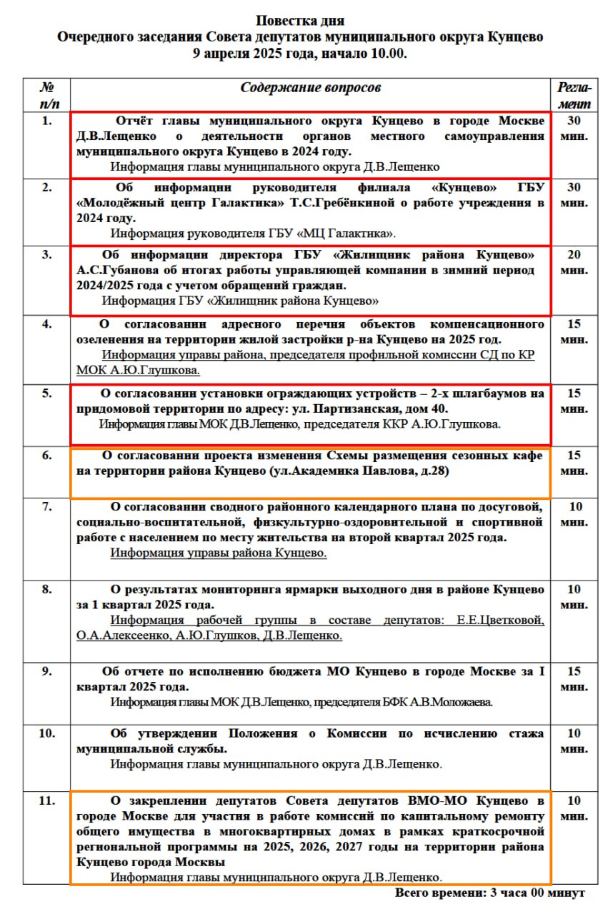 Очередное заседание районных депутатов Кунцево В повестке заседания: