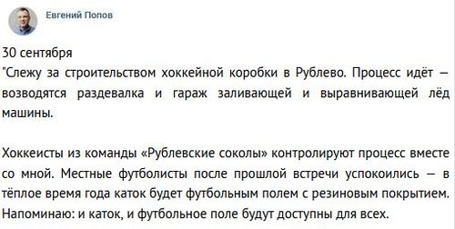 Хоккеисты из команды «Рублевские соколы» контролируют процесс вместе со мной. Местные футболисты после прошлой встречи успокоились — в тёплое время года каток будет футбольным полем с резиновым покрытием. Напоминаю: и каток, и футбольное поле будут доступны для всех.