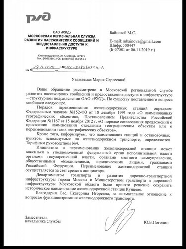 | Жителей столицы возмутили планы о переименовании железнодорожных станций: перед запуском центральных диаметров «Карачарово» станет «Нижегородской», а «Крюково» — «Зеленоградом». Это следует из документа, похожего на приказ РЖД, фотографиями которого делятся пользователи соцсетей. Москвичи боятся за локальную историю и просят власти оставить прежние названия. Зачем их менять? И что из этого выйдет? Разбирался Иван Корякин. АУДИО От старого Кунцево, которое когда-то было селом и даже городом, остались разве что храм Знамения, полуразрушенная усадьба Нарышкиных, вокзал и само название железнодорожной станции. Поэтому местные жители и заступились за него. Казалось бы, какая разница между «Кунцево» и предлагаемым новым названием «Кунцевская», но для жительницы этого района Марии существует принципиальная разница: «Есть картина Алексея Саврасова “Вид в селе Кунцево”, есть очень интересная картина “Станция без остановки. Кунцево”, автором которой является Казимир Малевич. «Название “Кунцево” — историческое, и оно сохраняет нашу связь с людьми, которые здесь жили в прошлом». Официально о переименовании пока не говорили, но фотографий документа, похожего на приказ РЖД, москвичам хватило, чтобы начать сбор подписей за сохранение исторического названия. Обращение в компанию готово — депутат из района Кунцево Денис Шендерович отправит его со дня на день: «Жители хотят сохранить историческое название, что логично. Я со своей стороны подготовил обращение в правительство Москвы и в РЖД с обоснованием и со ссылками на федеральный закон». Но переименование «Кунцево» в «Кунцевскую» — это косметический ремонт по сравнению с более смелым: «Ржевская» — в «Рижскую» и капитальными «Фрезер» — в «Андроновку» и «Крюково» — «Зеленоград». Последнее переименование особенно взволновало москвичей — речь идет об одной из первых в России железнодорожных станций. И не под Зеленоградом, а у деревни Крюково остановили немцев в 1941 году. Правда, на ее месте давно стоит город, что и вызывает путаницу, говорит руководитель направления «Общественный транспорт» экспертного центра Probok.net Александр Чекмарев: «Человек, который хочет уехать в Зеленоград, пытается найти станцию с таким названием, допустим, когда покупает билет или смотрит расписание, но он ее не находит. «Конечно же, есть те, кто будет вспоминать об историческом наследии. Но мы должны понимать, что навигация должна быть понятна для конечных пользователей, а не только для местных жителей». Аналогичная история — в наукограде Жуковский, где платформа называется «Отдых», но год назад РЖД предложила ее переименовать. Андрей Войтюк, который тогда возглавлял городской округ, решил сначала провести опрос в Facebook. Публикация опроса стала примером демократии, рассказал Войтюк “Ъ FM”: «Это самый лучший способ выяснить желания людей. Опрос показал, что люди не хотят переименовывать нашу станцию, так как это историческое название и все привыкли к “Отдыху”». Но если переименование «Кунцево» и «Крюково» еще объяснимо, то в случае с «Ховрино», которая должна стать «Староховрино», — сложнее. Возможно, потому что был поселок Новоховрино. Но ведь на карте Москвы нет Старого Арбата — есть лишь Новый. А если платформу «Сколково», которая прежде называлась «Востряково», переименуют в «Мещёрскую», ка