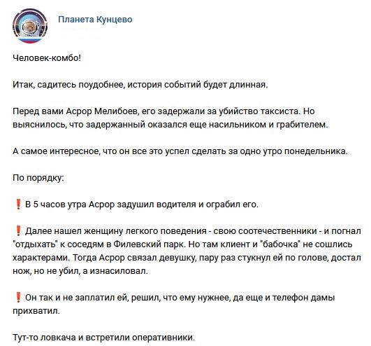 | Тело водителя с признаками асфиксии обнаружено в автомобиле такси во дворе дома на территории столичного района Кунцево. Об этом Агентству городских новостей «Москва» сообщили в пресс-службе Главного следственного управления Следственного комитета (СК) России по городу. «Во дворе жилого дома, расположенного по ул. Ельнинская в Москве, в автомобиле такси обнаружено тело водителя 1972 года рождения с признаками насильственной смерти в виде асфиксии. На месте работают следователи Кунцевского межрайонного следственного отдела СУ по ЗАО ГСУ СК России по Москве», - рассказала Иванова. По данному факту было возбуждено дело по ч. 1 ст. 105 УК РФ («Убийство»). Как сообщили Агентству «Москва» в пресс-службе московской прокуратуры, надзорное ведомство взяло на свой контроль ход и результаты расследования данного уголовного дела. Кроме того, на место происшествия для координации работы правоохранительных органов выехала заместитель Кунцевского межрайонного прокурора Ирина Хархавкина. 14:00 Подозреваемый в убийстве таксиста на западе Москвы задержан: Сотрудники правоохранительных органов задержали подозреваемого в убийстве водителя такси, тело которого было обнаружено в автомобиле во дворе дома в столичном районе Кунцево. Об этом Агентству городских новостей «Москва» сообщили в пресс-службе Главного следственного управления Следственного комитета (СК) России по городу. «Благодаря совместной работе следователей и сотрудников уголовного розыска задержан подозреваемый в убийстве водителя такси на западе Москвы. При нем обнаружена банковская карта потерпевшего. В скором времени он будет доставлен в подразделение ведомства для проверки на причастность к совершенному преступлению», - заявила Иванова. Как пояснили в беседе с Агентством «Москва» в ГУ МВД по столице, 33-летний подозреваемый в убийстве был задержан в ходе оперативно-разыскных мероприятий оперативниками уголовного розыска столичной полиции в одном из домов на ул. Большая Филевская. Добавлено 23.11.2022г.: Убийца московского таксиста оказался насильником Сыщики раскрыли два преступления вместо одного Сотрудникам полиции удалось раскрыть ограбление и изнасилование женщины, оказывавшей интим-услуги выходцам из Средней Азии. Выйти на след бандита удалось в ходе расследования другого преступления – убийства таксиста. Выяснилось, что оба злодеяния совершил один и тот же человек, причем с интервалом в несколько часов. Как ранее сообщалось, утром в понедельник во дворе дома по улице Ельнинской, в такси марки «Хендэ» был обнаружен труп 50-летнего водителя, уроженца Кыргызстана. Экспертиза показала, что его задушили. Оперативники быстро вышли на след подозреваемого и задержали его тем же днем на улице Малая Филевская. 33-летний уроженец Узбекистана, подрабатывавший в Москве на стройке, признался, что убил таксиста с целью ограбления. Добычей бандита стали банковская карта и 5000 рублей. А тем же вечером в полицию с заявлением об ограблении обратилась жительница той же Малой Филевской улицы. 37-летняя уроженка Узбекистана снимала квартиру для оказания интимных услуг. Выяснилось, что после убийства водителя азиат решил развлечься с проституткой, нашел ее по объявлению и приехал на адрес. Однако условия оплаты услуг не устроили убийцу. Он пригрозил женщине ножом, избил ее, связал р