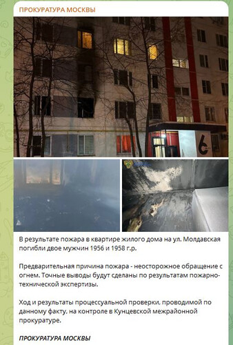 | Два человека погибли при пожаре на западе Москвы. Причиной пожара, предварительно, стало «неосторожное обращение с огнем», сообщили в прокуратуре. По данным столичной прокуратуры, в результате пожара в жилом доме на Молдавской улице, который возник сегодня ночью, погибли двое мужчин. Возгорание в квартире, предварительно, произошло из-за неосторожного обращения с огнем. «Точные выводы будут сделаны по результатам пожарно-технической экспертизы», — добавили в ведомстве. ПРОКУРАТУРА МОСКВЫ | |